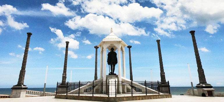 The four-meter high statue of Mahatma Gandhi is surrounded by eight granite pillars, which were supposedly brought from Gingee, a fort some 70 km from Pondicherry. The statue is placed in the middle of a garden situated at Dumas Street and attracts tourists in large number..